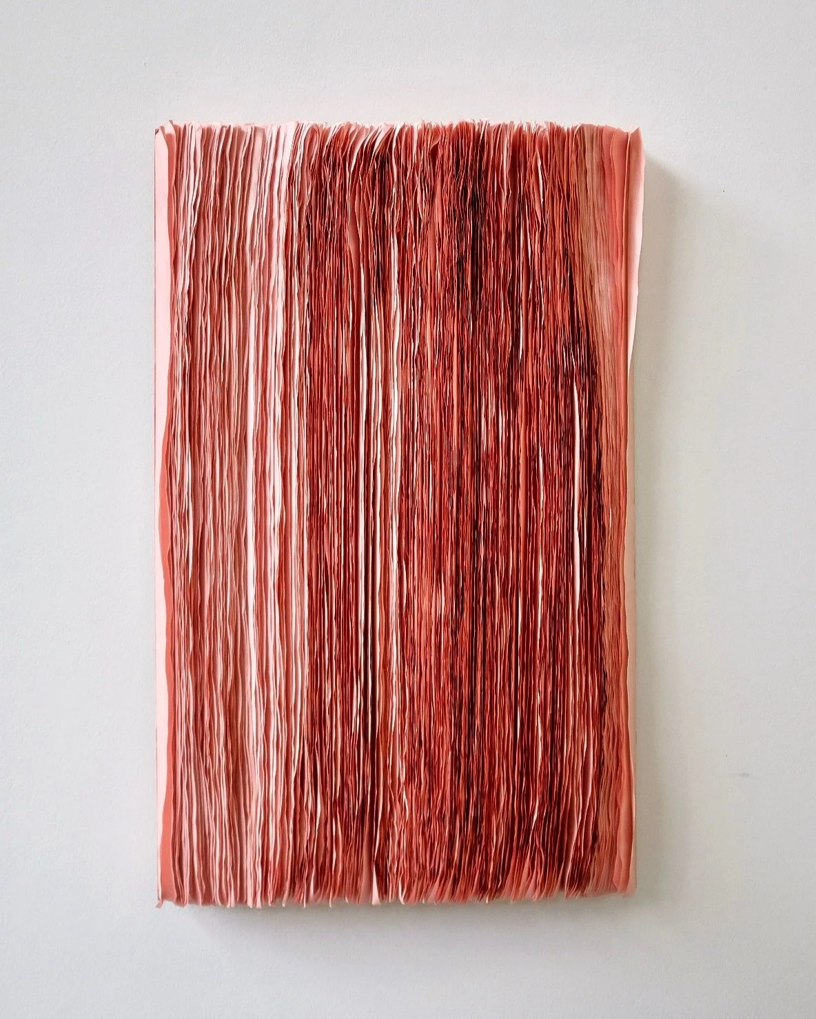 This diptych of textured panels draws inspiration from the gilled underside of mushrooms. One panel features hundreds of meticulously hand-cut rice paper strips, while the other incorporates pleated paper remnants from the fabric pleating process in Flow. Hand-dyed in soft, varying tones, the strips create rhythmic patterns and shifting shadows, inviting contemplation of the beauty found in repetition and transformation.
